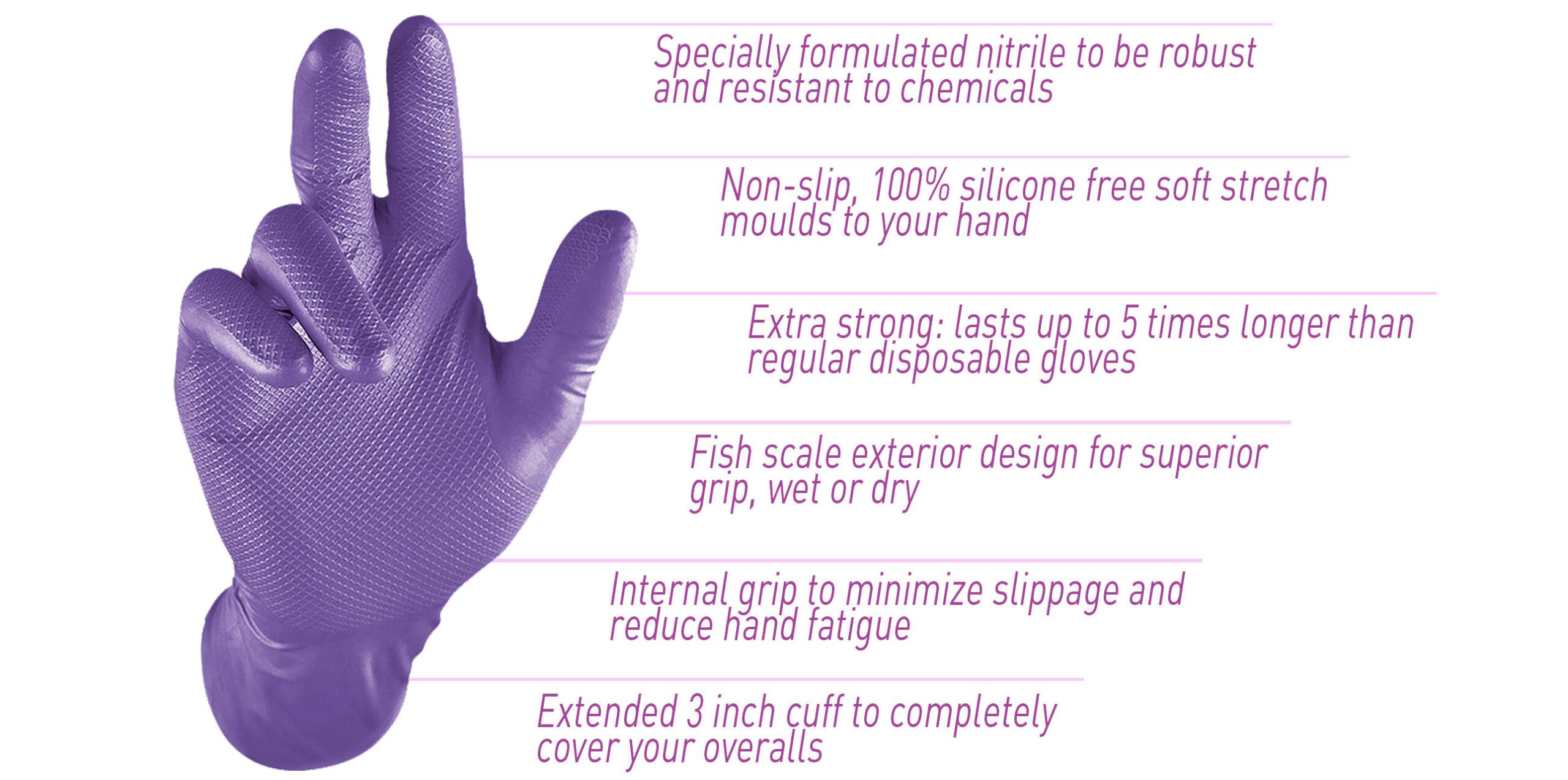 The BAXT CARBONgrip Premium Nitrile Gloves have been manufactured with an extended 3 inch cuff to ensure your coveralls are sufficiently covered – preventing materials, dust, grime and paint from getting under your coveralls.