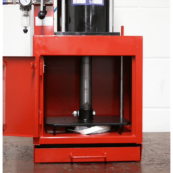 Pneumatic paint can crusher - crushing paint cans minimizes the volume of your hazardous waste. Comes with safety lock-out device which prevents the door being opened during operation. Bench mounting unit with outlet for waste paint collection.