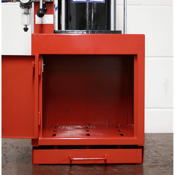 - Air operated paint can press with safety lock-out device which prevents the door being opened during operation.