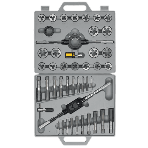 Precision machined from Tungsten steel, this set features taps and dies with the dies being split to facilitate the fine adjustment of core diameter. It includes Metric coarse and fine sizes, along with a sliding jaw type tap wrench and a T-Bar type tap wrench, paired with a steel die holder equipped with knurled screws. Everything is supplied in a heavy-duty carry-case for enhanced durability and ease of transport.