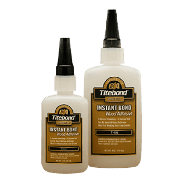 Titebond Instant Bond is a two-part bonding system that takes between 5 - 15 seconds to set and 30 - 60 seconds for initial cure. It provides a strong, permanent bond and is ideal for hard to reach joints or surface areas that are difficult to clamp. Designed primarily for wood and wood products, this adhesive is also very effective on a wide variety of materials and substrates. Titebond Instant Bond Thin viscosity product offers the fastest assembly time of 5 seconds and an initial cure speed of 3 seconds. It is ideal for repairing hair line cracks and small defects in wood, as well as repairing loose veneer edges. It can also be used as a finish. While Titebond Instant Bond Activator can be used to further reduce set times, it is not required for producing strong, tight-fitting joints.