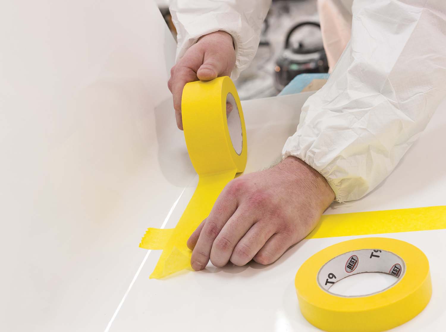 The specific formulation of the T9 High Performance Masking Tape allows it to be used perfectly even in overlapping and with masking paper or film applied. The tape can be used over longer periods of masking and leaves no adhesive residue or tears when removed.