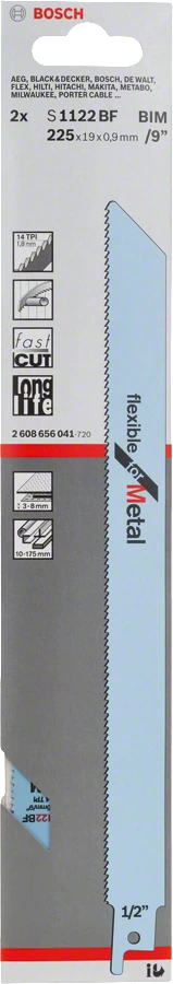 Bosch S1122BF Metal Reciprocating Saw Blade is optimised for flush cutting in metal. 225 mm length and standard-gauge material thickness of 0.9 mm enable excellent flush cuts. Tooth pitch of 1.8 mm for working at high speeds. Fits all S-shank reciprocating saws.