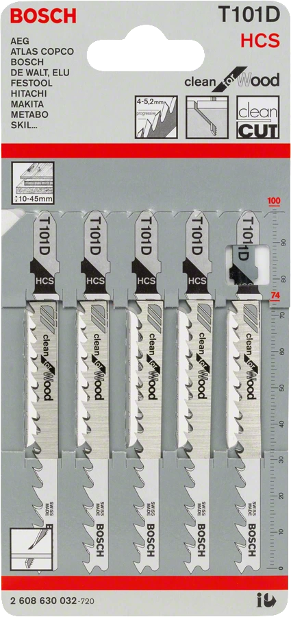 Clean for Wood Jigsaw Blade delivers clean straight cuts in wood. Precision-ground teeth with taper-ground body produce clean results. High carbon steel material is appropriate for cutting softwood and non-abrasive woodworking materials. Fits all T-shank jigsaws.