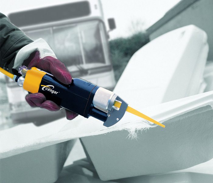 Cuts GRP up to 6mm (1/4″) thick, Metal up to 3mm (1/8″) thick. This short stroke, very fast cutting Cengar JP901 Reciprocating Airsaw was made especially for cutting thin section glass fibre reinforced plastics up to 6mm (1/4″) and light gauge metal up to 3mm (1/8″) thick. Using Cengar Yellow Notched and Tapered shape Blades allows cutting of tight circles and shapes, such as instrument panels in boats, buses, trucks & cars. Standard 12mm (1/2″) Bi-Metal Blades can also be used for cutting fabricated products.