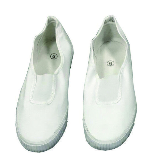 White slip on plimsolls made with a canvas upper and a rubber sole.