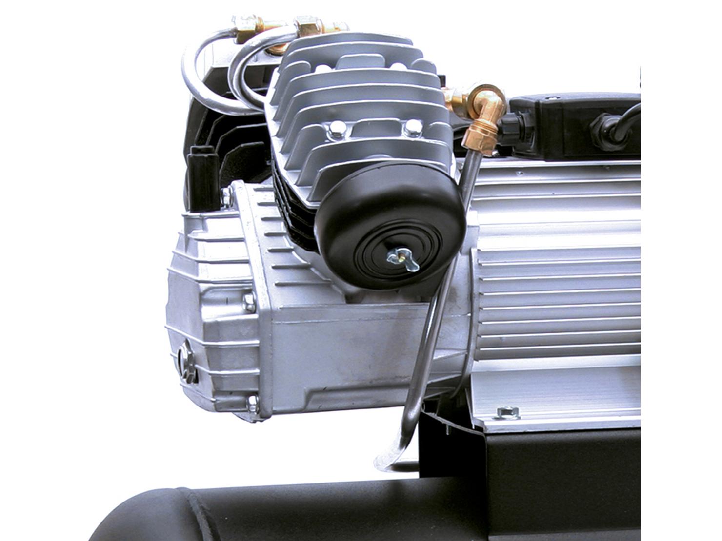 This oil lubricated compressor is operated by a 3.0hp electric induction motor with an aluminum crankcase and a cast-iron pump unit, the compressor offers powerful and robust performance with an efficient cooling system. With a piston displacement of 14CFM, 9.5CFM free air delivery and a maximum pressure of 9bar Suitable for both the professional and occasional user, the machine comes supplied with two integral wheels that afford the operator with easier maneuverability. 50 litre tank.